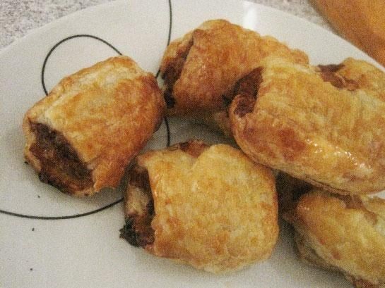 Coloca una pequeña cantidad de la mezcla de carne a lo largo de uno de los trozos de masa; de largo a largo. Cepille el borde opuesto con la leche y el huevo combinados.