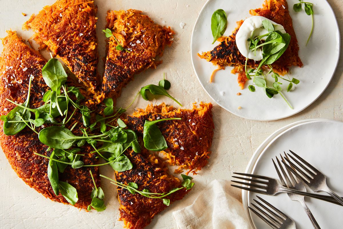 Este plato es un juego de esa colaboración original. La batata cruza naturalmente la línea entre dulce y salado. Al igual que las manzanas. A ambos les encanta la pimienta negra, así que voy un poco más pesado aquí que en la mayoría de las recetas. Puede dorar el lirio agregando un puñado de queso cheddar rallado o raclette encima del rosti antes de hornear, pero esto no es necesario. O puede servir salsa de arándanos a un lado para que sea más festivo para el invierno.