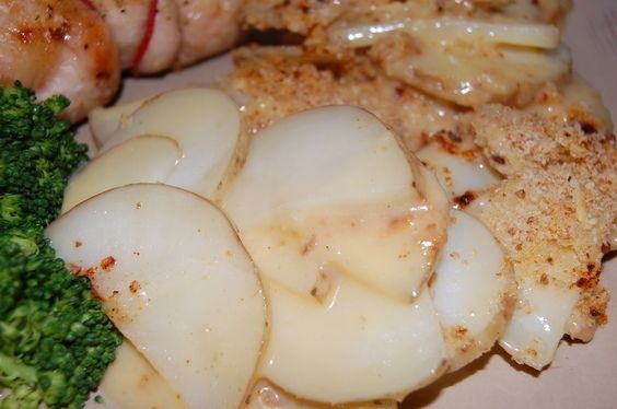Vierta uniformemente sobre las papas. Agite suavemente el plato para permitir que la mezcla pase a través de las capas de papa.