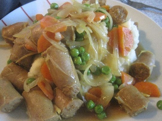 Sirva la mezcla de salchichas sobre el arroz.