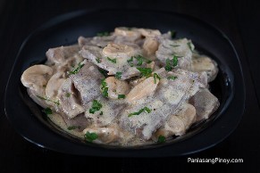 Tierna lengua de res en una rica y cremosa salsa blanca de champiñones.