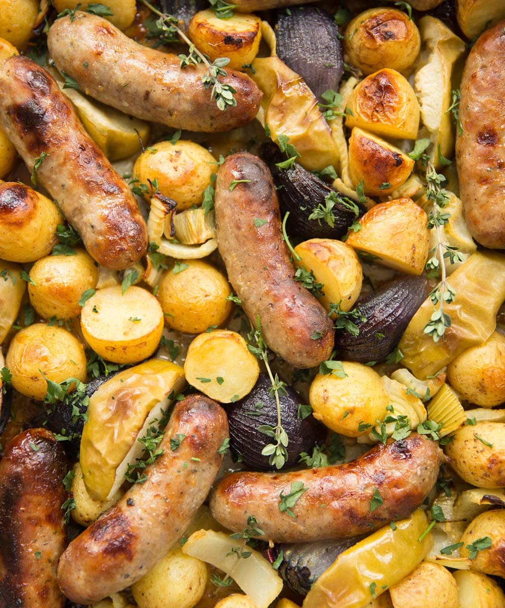 La mayoría de las recetas de salchichas las veo como una oportunidad para lanzar mis salchichas caseras al ruedo. Sin embargo, cocinar en sartén tiene que ver con la conveniencia, por lo que las salchichas compradas en la tienda son perfectas para esta receta.