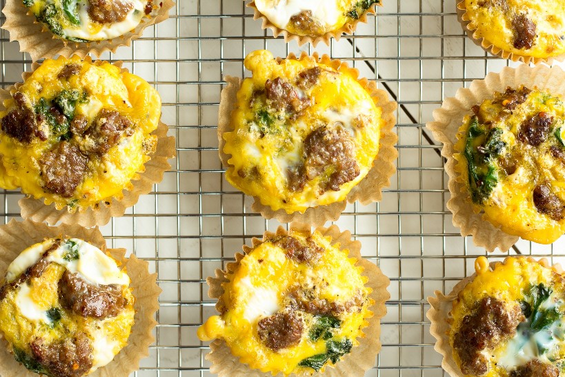 Estos panecillos de huevo con salchicha y col rizada son un desayuno bajo en carbohidratos, sin granos y alto en proteínas que puede preparar con anticipación y guardar en el refrigerador. Por la mañana, caliéntalos y toma un desayuno rápido y saludable.