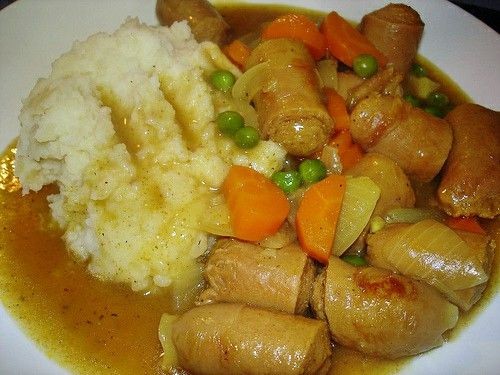 Mezcle aproximadamente 2 cucharadas de harina de maíz con una pequeña cantidad de agua para hacer una pasta fina, agregue lentamente a las salchichas mientras revuelve hasta obtener la consistencia adecuada. Cortar las zanahorias en trozos de unos 2 cm y las judías partidas en trocitos pequeños.