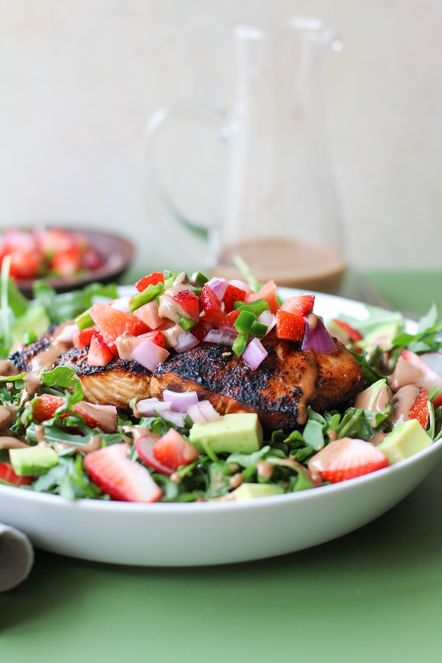 Están sucediendo tantas cosas en este tazón que apenas puedo contener mi euforia. Teníamos salmón a la parrilla con perejil fresco sobre una ensalada de rúcula especiada, todo cubierto con una vinagreta balsámica de fresa. Estoy empezando a pensar que el aderezo de vinagreta casera PLUS es la clave para todos los alimentos. ¡Hablemos de los componentes de la receta!