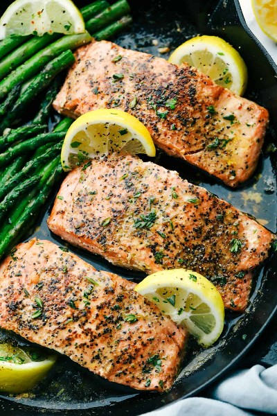 ¡El salmón es rápido y fácil de hacer e increíblemente delicioso! Si te encanta todo el sabor del salmón, prueba este salmón de arce con corteza de nuez, salmón asado con miel y ajo dijon (¡15 minutos!) o salmón asado con sésamo y teriyaki.