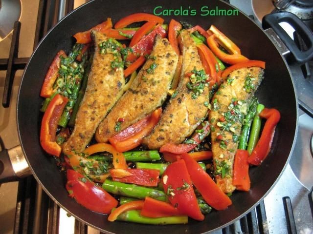 Añadir el salmón y freír hasta que esté dorado. Voltee y agregue los espárragos y la pimienta junto con el pescado.
