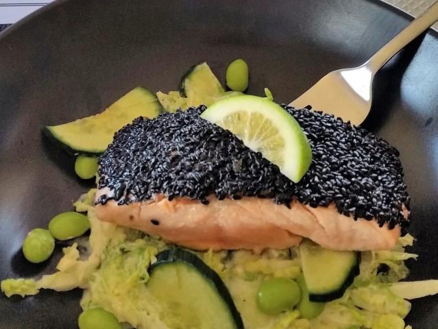 Calienta una sartén a fuego medio a fuego medio, engrasa ligeramente con un poco de aceite, cocina los filetes con el ajonjolí hacia abajo, hasta que estén medio cocidos, voltea y cocina por unos minutos más, los filetes deben estar bien cocidos, para que el el salmón no se seca