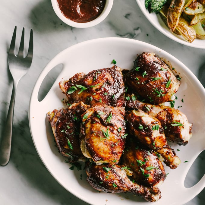 Algunos fines de semana, llevábamos a casa casi diez libras de fresas después de nuestro primer viaje a nuestra granja local favorita. Eché un poco en el congelador para hacer batidos y (con suerte) un lote de mermelada de finales de verano (¡si duran tanto!). Arrojé un poco a las ensaladas, mientras que otros puñados fueron a parar a nuestras glotonas bocas. Sin embargo… persistieron. Así que terminé haciendo un lote de esta dulce y picante salsa barbacoa de fresa. Esta receta es suficiente para dos comidas, así que engrasé ligeramente todos esos trozos de pollo con el hueso y los cubrí con estragón fresco de la huerta. Una comida verdaderamente perfecta de finales de primavera/principios de verano. Casiano, alias el comedor más quisquilloso de todos los tiempos, comió hasta el último bocado de su cena. Una señal segura de una cena de pollo ganadora. Sígueme en Instagram para ver lo que hice con el resto.