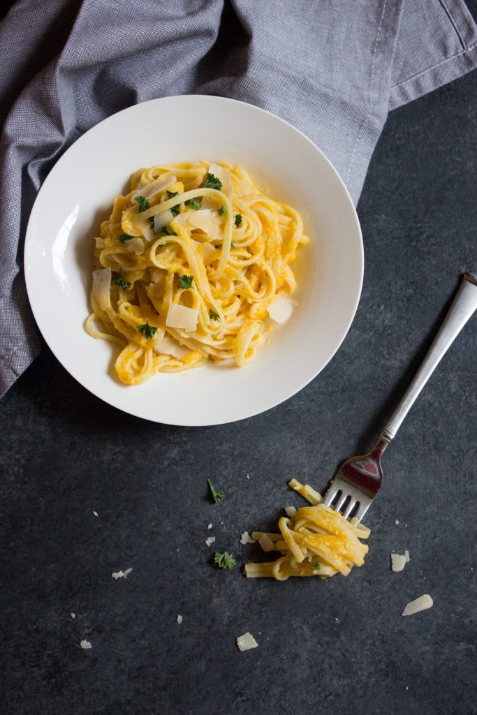 Me gusta servir esta salsa de pasta de calabaza con un poco más de queso parmesano y perejil fresco picado. (A menos que sea para mis hijos… ¡entonces doble el queso parma y retire las cosas verdes!)