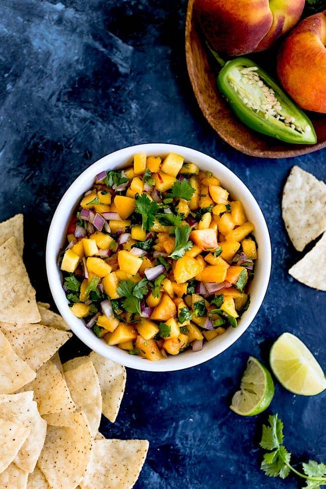 La salsa de durazno es un gran aperitivo o refrigerio cuando se sirve con papas fritas. Nos gusta hacer papas fritas caseras o tortillas horneadas caseras, pero las papas fritas compradas en la tienda también son buenas. Las papas fritas saladas son perfectas con salsa dulce de durazno.