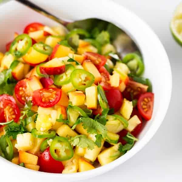 La jugosa piña, el tomate y el durazno se relajan con un buen chorrito de jugo de lima y un poco de calor de jalapeño. ¡Sí!