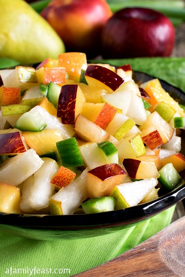También adaptado de esta receta que recorté de las páginas de Better Homes and Gardens hace años, tengo que admitir una cosa. Inicialmente, ¡no estaba muy seguro de la combinación de sabores en esta receta! Esta salsa incluye una mezcla de fruta fresca picada que incluye peras, melocotones o nectarinas y ciruelas, luego la fruta se combina con pepino sin semillas y se pica.