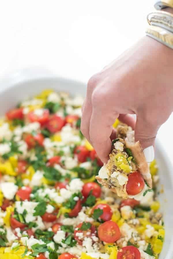 Una receta simple de refrigerio de cinco ingredientes, esta salsa de hummus asado de inspiración griega está cargada con cordero y queso feta, luego se cubre con muchas verduras crujientes.