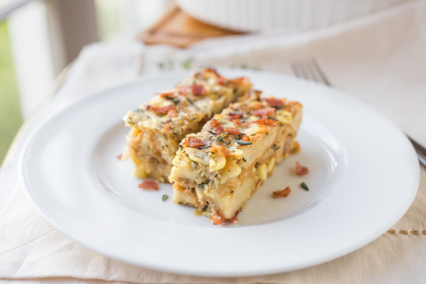 -A esto, agrega la mayor parte del crocante de jamón, reserva 1 cucharada, que reservarás para usar como guarnición; También agregue la mezcla de cebolla/ajo, perejil, 1 cucharadita de hojas frescas de tomillo, condimento italiano, ½ cucharadita de sal y pimienta y maíz, y mezcle los ingredientes para combinarlos ligeramente.