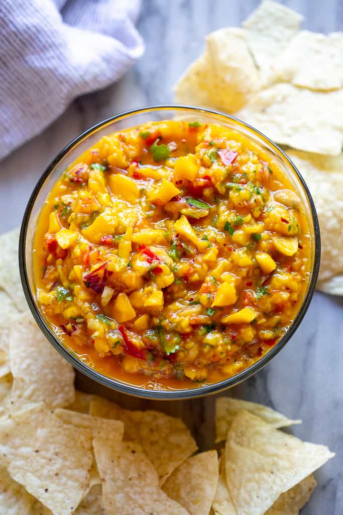 Sólo un bocado de este increíble hecho en casa salsa de mango ¡y te engancharás! Está hecho con ingredientes frescos y frescos y minutos de su tiempo y se puede servir con costillas o cubierto con tacos, quesadillas, ensaladas, burritos y más.