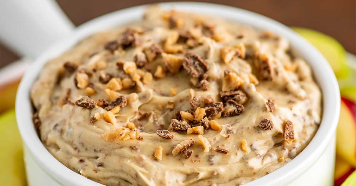 ¡Esta sabrosa salsa de manzana y ladrillo combina manzanas frescas, queso crema dulce y barras Heath trituradas para crear una salsa de postre divertida que es perfecta para fiestas o refrigerios!