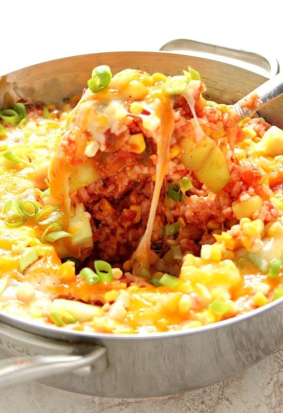 Si eres como yo y comiste tanto arroz en la cena, déjame presentarte mi nueva versión de este plato popular. Es cursi, lleno de sabor y lleno de nuestras verduras de verano favoritas: ¡maíz y calabacín! ¡Sí, un tazón grande de eso, por favor! ¡Sírvelo con tacos, enchiladas, burritos o lo que tu corazón desee y listo!