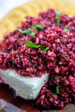 Vertimos esta salsa de arándanos sobre el queso crema y luego la pegamos sobre las galletas saladas. Cielo absoluto, amigos!