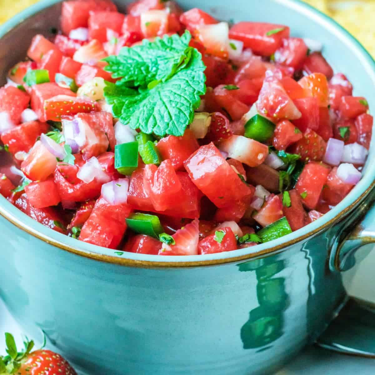 Dulce y picante, esta salsa está hecha con sandía, fresas, hierbas, miel, jalapeño y cebolla. Come con papas fritas o tacos o con tus proteínas favoritas. Esta publicación puede contener enlaces de afiliados. Lea mi política de divulgación aquí.