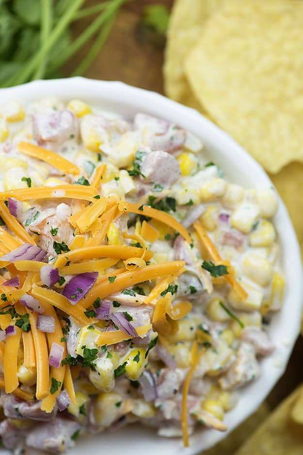 Esta salsa de maíz con queso está lista en solo cinco minutos con un trabajo mínimo. Solo mézclalo todo y sírvelo con chips de tortilla.