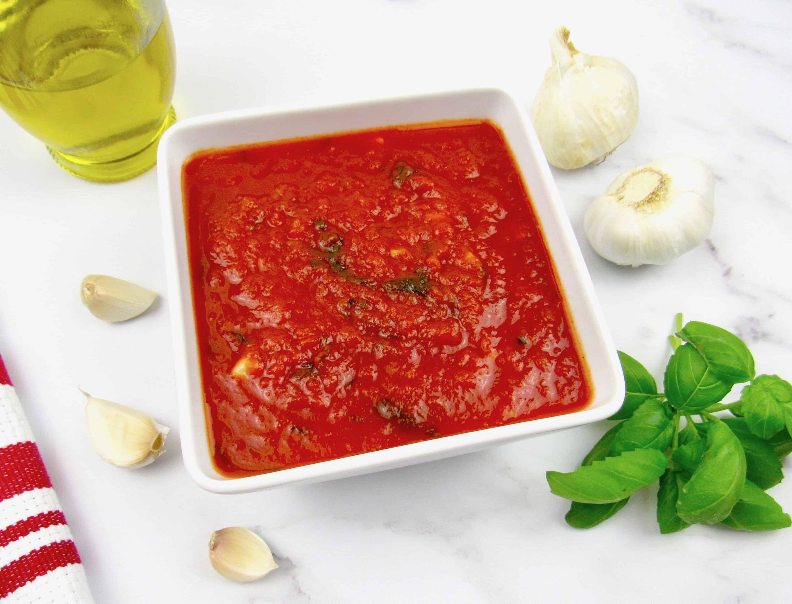 Llena de sabor, ¡esta marinara es tan versátil! ¡Combina perfectamente con palitos de mozzarella caseros bajos en carbohidratos, bocados de pizza o baguettes Keto!