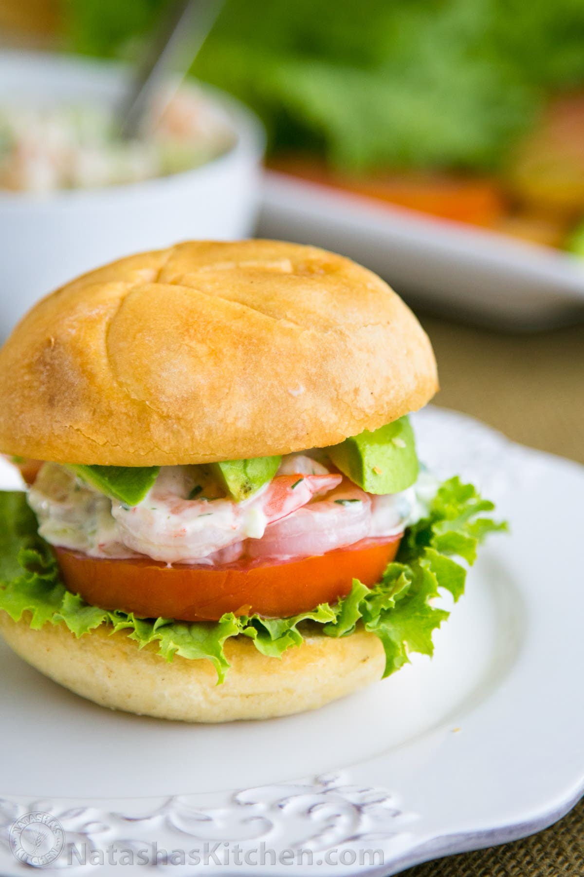 Me encanta que no se requiera cocinar con esta receta de sándwich de camarones (especialmente si compras camarones precocidos), ¡lo cual es tan tentador cuando las temperaturas exteriores alcanzan los 100 grados! Esta es una excelente manera de usar tomates reliquia de temporada y lechuga fresca. Use una variedad colorida de tomates para adornar su plato.
