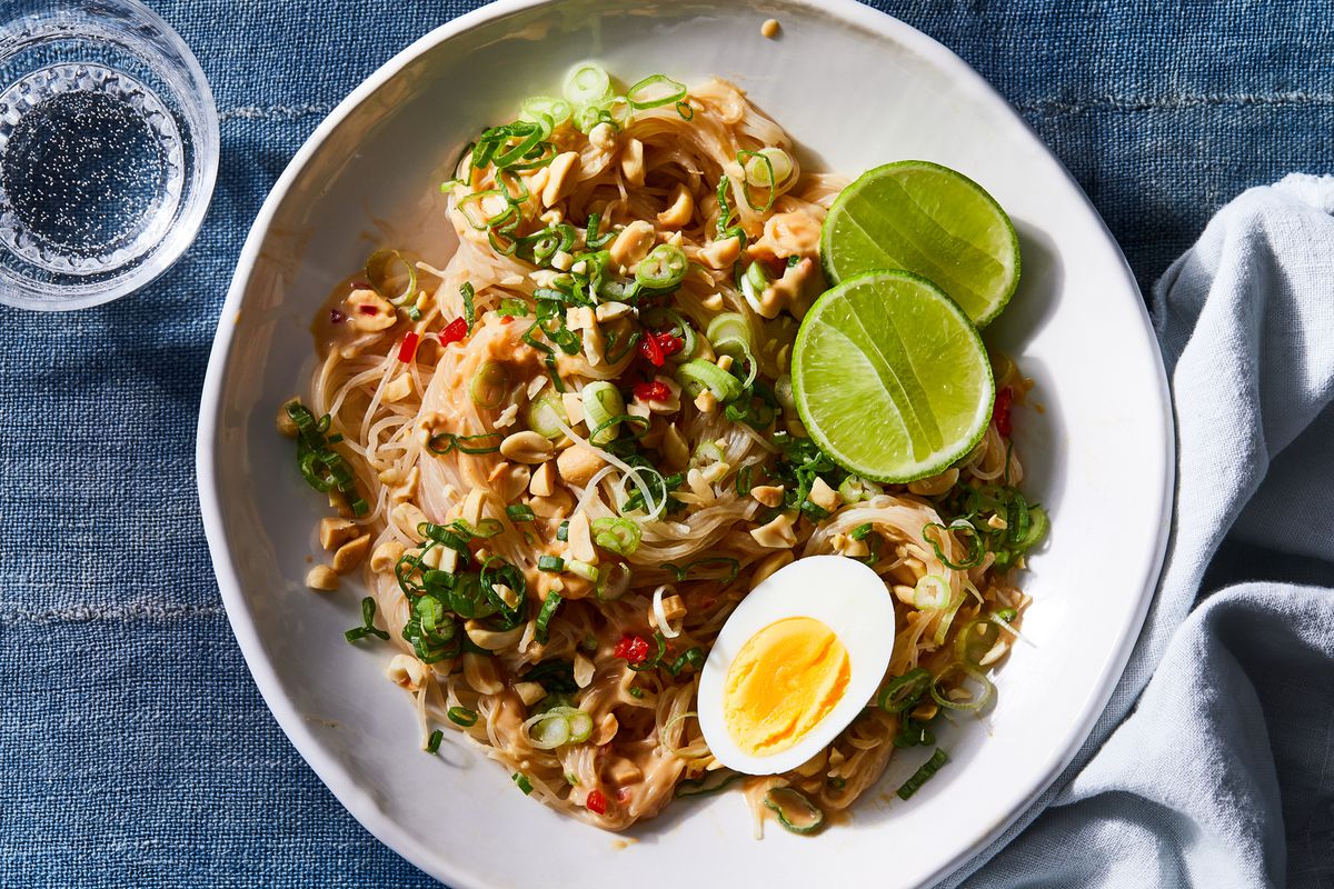 Combine los fideos y los brotes con la mitad de la salsa en un tazón grande y mezcle suavemente con 2 tenedores. Pelar los huevos y cortarlos por la mitad a lo largo. Decora la pasta con los huevos, las chalotas y los cacahuetes y sirve a temperatura ambiente, pasando por la mesa las rodajas de lima y el resto de la salsa y guindillas.