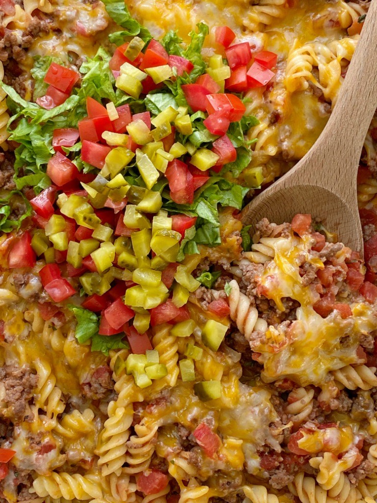 Sándwich de queso en cazuela está lleno de especialidades de hamburguesa con queso como carne molida, cebolla, ajo, tomates cortados en cubitos, pasta en espiral, mostaza, aderezos y mucho queso. ¡Diferente de las tradicionales cazuelas de sopa cremosa y adecuada para familias!