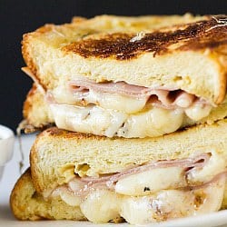 Porciones: 4 sándwiches Preparación: 10 minutos Cocción: 20 minutos Total: 30 minutos Una variación del Croque Monsieur, es un sabroso sándwich de jamón y queso preparado como pan francés, servido con mermelada de frutas enlatadas o jarabe de arce.