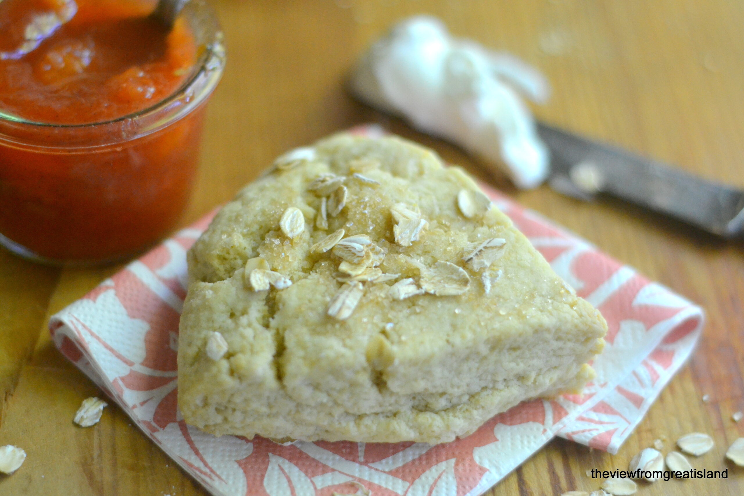 Este es un gran combo de desayuno de verano. Los bollos son húmedos, desmenuzables y de avena, y la mermelada es pura fruta soleada. Si miras de cerca, verás que robé vainilla. El ruibarbo agrega algo de color y atraviesa la dulzura de los melocotones.
