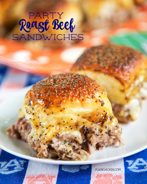 Sándwiches de carne asada para fiestas – LOCO ¡Bueno! ¡Somos totalmente adictos a estos bocadillos! Muffins hawaianos, rosbif, queso blanco americano, cubierto con mantequilla, azúcar moreno, salsa de rábano picante, salsa Worcestershire y semillas de amapola. ¡Estas cosas pasan rápido! Siempre doblo la receta. ¡También son muy calentitos!