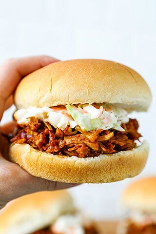 ¿La mejor parte de estos sándwiches de cerdo? Por un lado, es vegano, lo que significa que está libre de crueldad, lo que siempre es mejor si me preguntas. En segundo lugar, es mucho más bajo en grasas y calorías, lo que significa que tienes más, menos culpables.