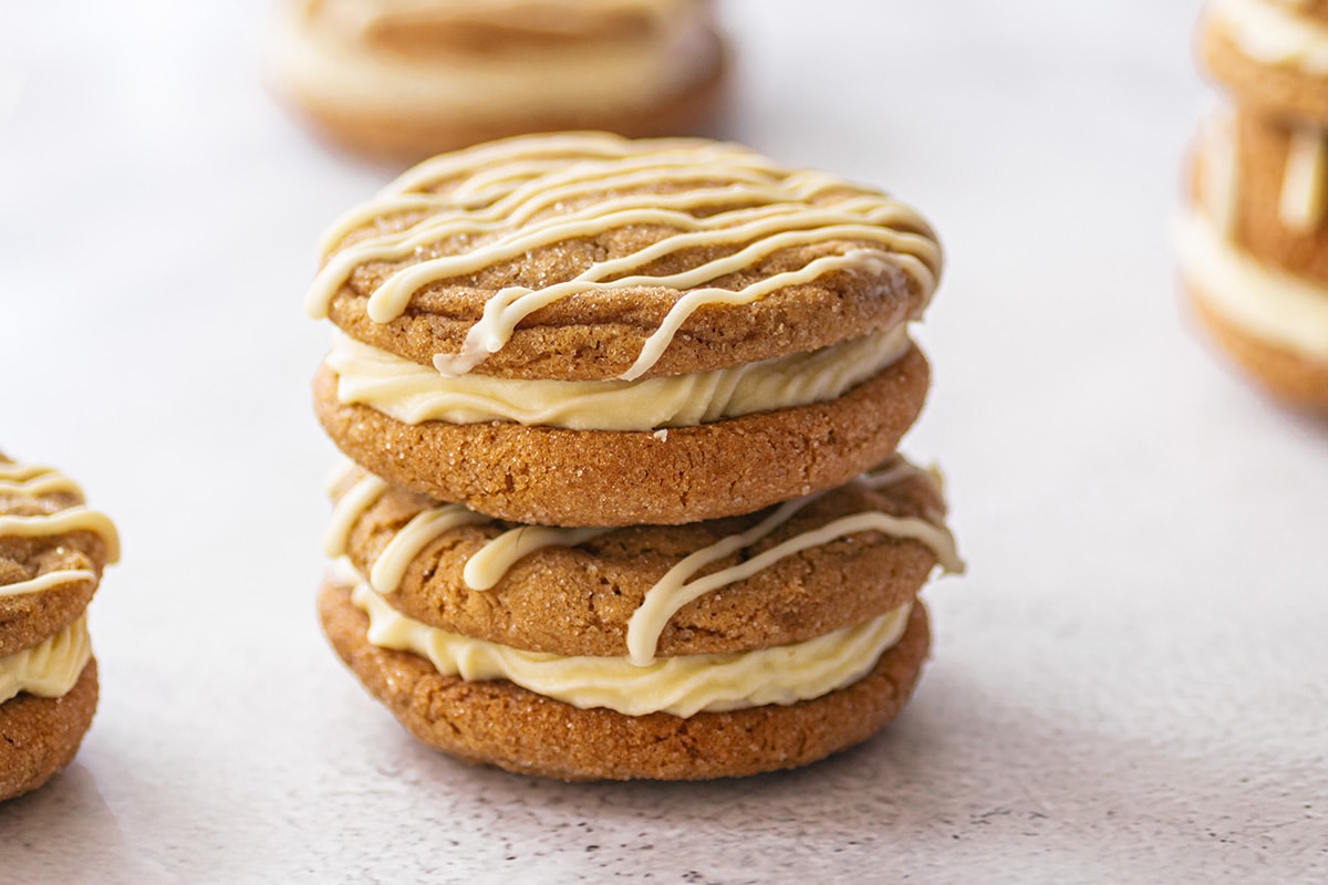 ¡Los sándwiches caseros de galletas de melaza suaves y masticables con un relleno de queso cremoso y sedoso toman solo unos minutos y seguramente se convertirán en los favoritos de la familia en cualquier temporada de vacaciones!