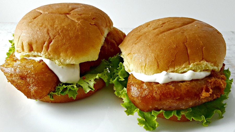 Los sándwiches de pescado empanizados con cerveza son livianos, hojaldrados, suaves y húmedos, cubiertos con un trozo de cerveza frita hasta que estén crujientes y dorados. Servir sobre pan con salsa tártara casera y lechuga.