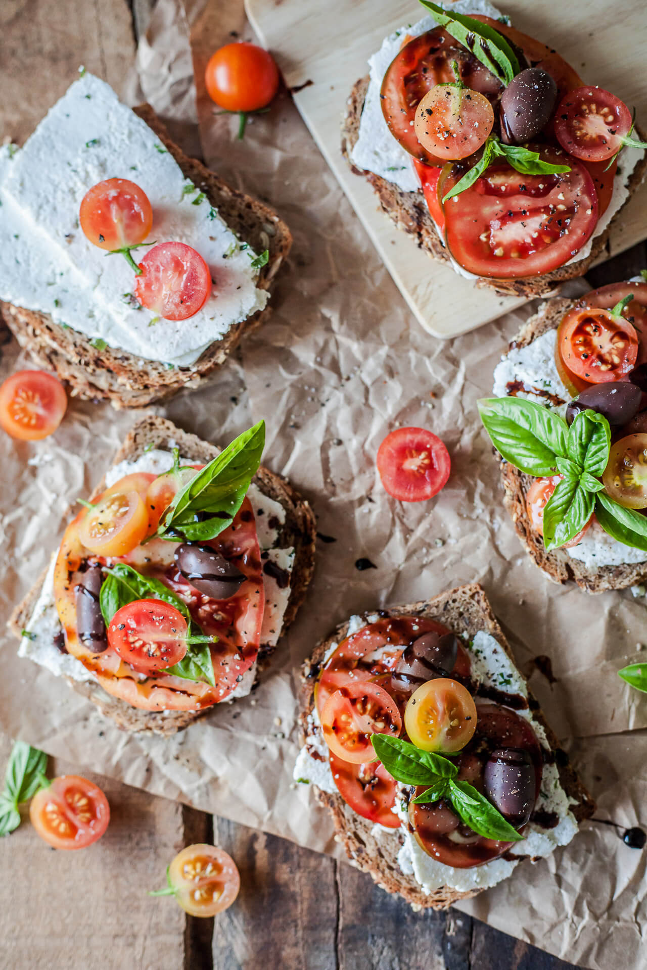 Estos sándwiches abiertos están cubiertos con ricotta y tomates de leche de cabra, espolvoreados con aceitunas negras y cubiertos con una deliciosa reducción de vinagre balsámico. Tostar ligeramente el pan antes de usarlo para darle frescura y sabor. De esa manera, incluso puede usar pan crujiente, ¡asegúrese de untarlo con una fina capa de mantequilla antes de tostarlo!