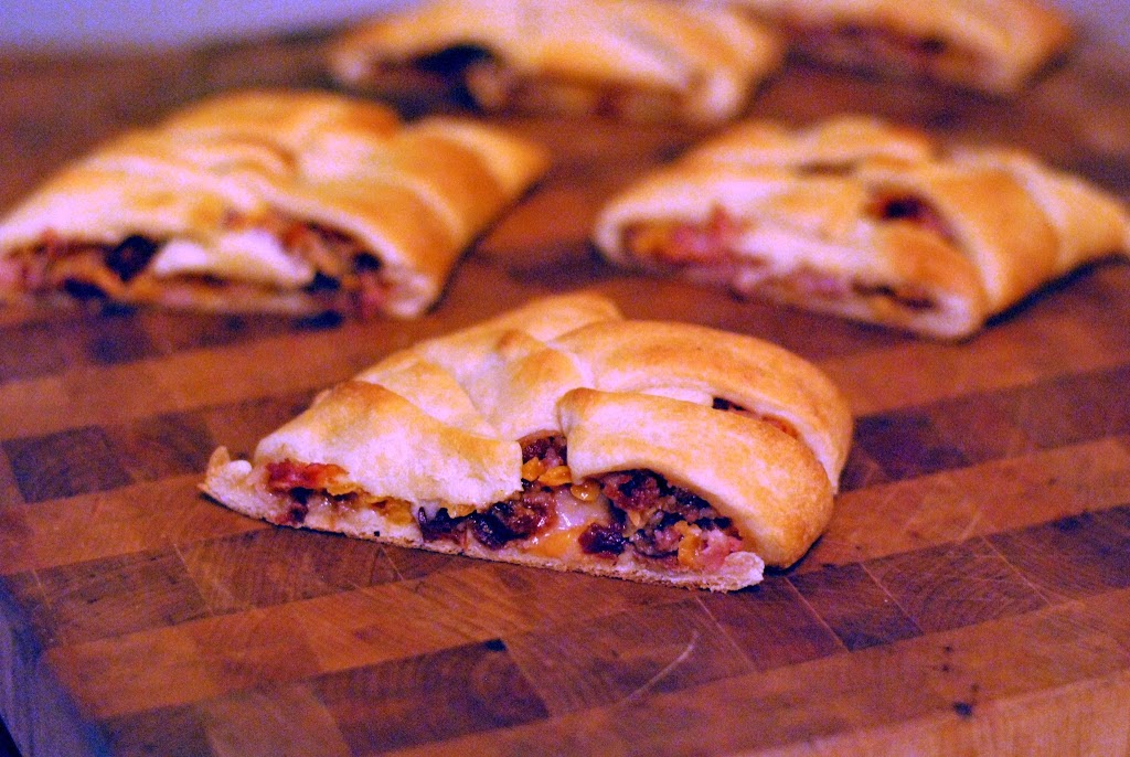 Mezcle el jamón, el pavo, el tocino cocido, el queso y la mostaza con miel. Coloque los rollos de media luna en una bandeja para hornear, no los separe individualmente. Sella las perforaciones. Distribuya la mezcla de carne y queso de manera uniforme a lo largo del centro de la hoja en crecimiento a lo largo. Cortar 10 tiras de cada lado de la masa. Tira de cada tira hacia el centro, alternando los lados, cada una ligeramente por encima de la anterior para formar una “trenza”. Hornee a 350 grados durante 15-20 minutos o hasta que esté ligeramente dorado. Dejar reposar durante 5 minutos antes de cortar. Si lo desea, corte en ángulo y cubra con lechuga y tomate picados. ¡Gustar!