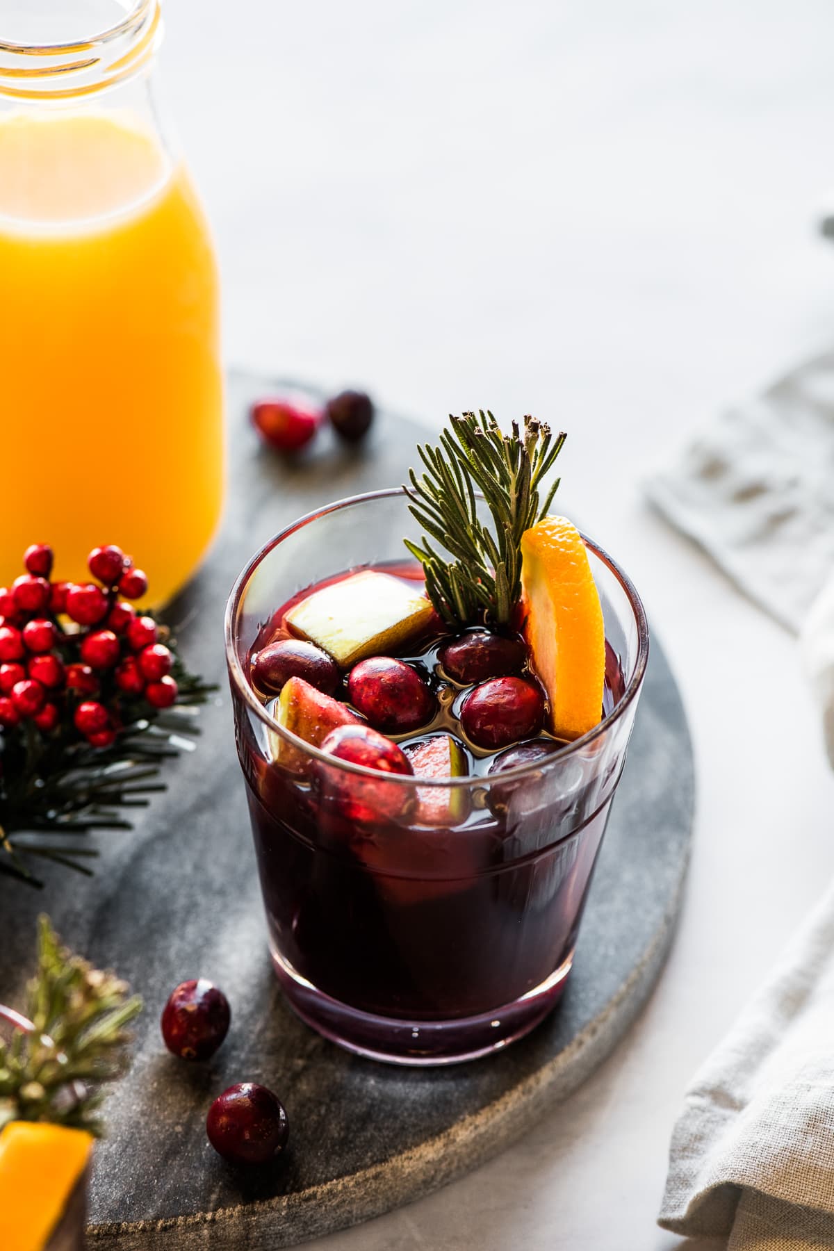 Sangría de invierno elaborada con una mezcla de frutas de temporada, vino tinto, hierbas y especias y brandy de manzana. ¡Fácil de hacer y perfecto para fiestas!