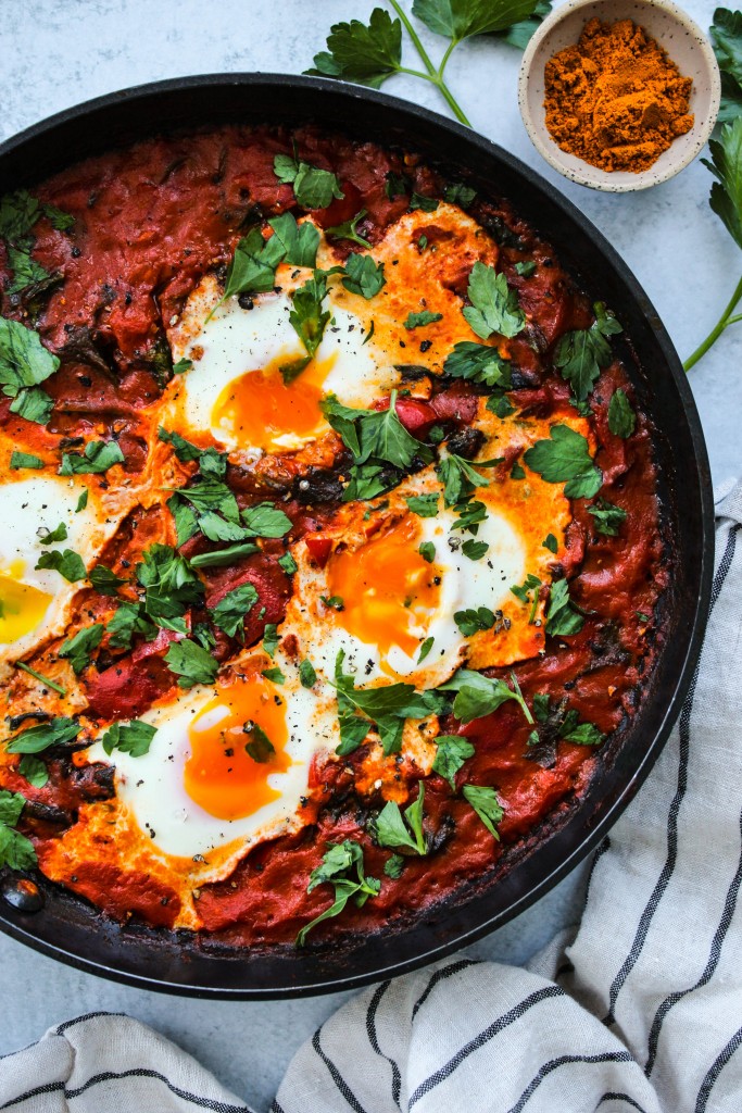 La mayoría de las recetas de shakshuka son increíblemente saludables y están llenas de ingredientes nutritivos como verduras, hierbas frescas y huevos ricos en proteínas. Este shakshuka de curry de coco está hecho con ingredientes como: