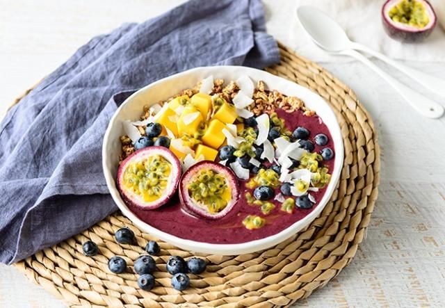 Vierta el batido en el recipiente y agregue la fruta de la pasión, el muesli y la fruta fresca de su elección.