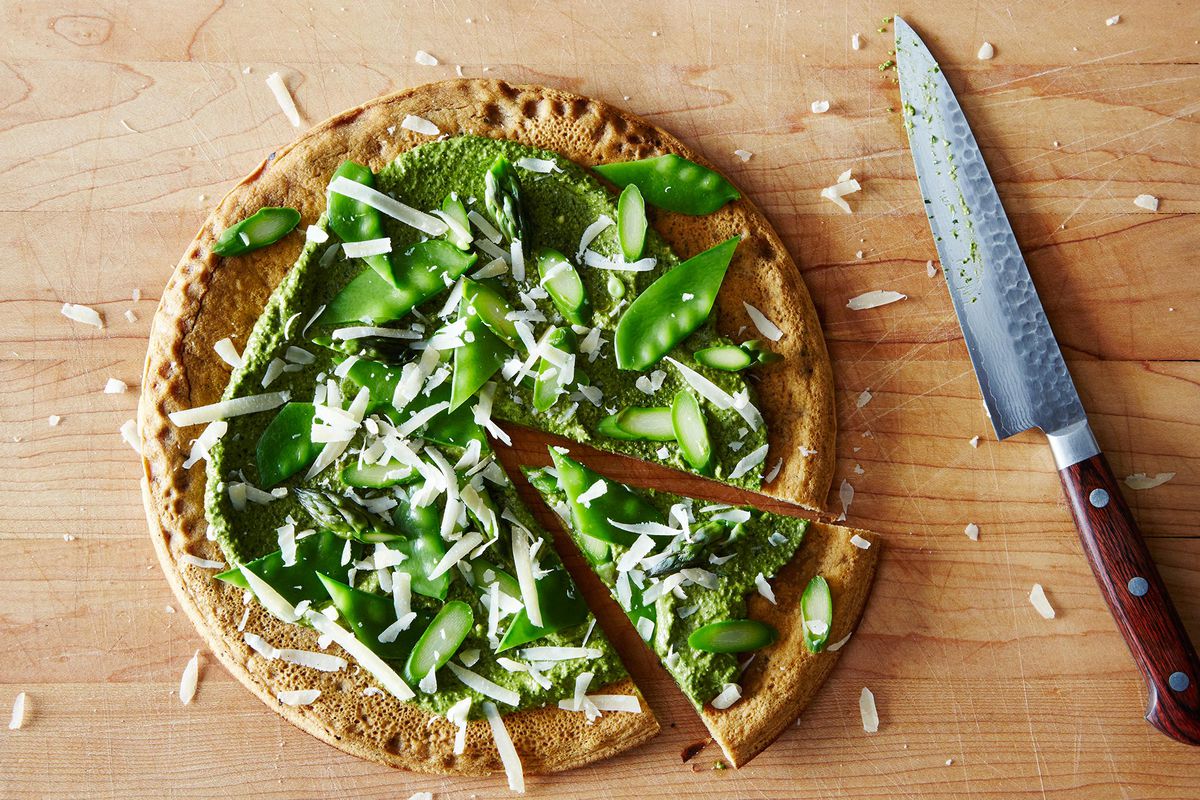 Socca tiene un suave sabor a nuez y combina bien con la mayoría de los ingredientes, así que siéntete libre de ser creativo. Para esta receta, elegí hacer un solo crepe grueso para sostener los ingredientes, pero también puedes hacer crepes más delgados y servirlos individualmente en lugar de rebanarlos. Si está haciendo crepes más delgados, reduzca el tiempo de cocción. – Pelar