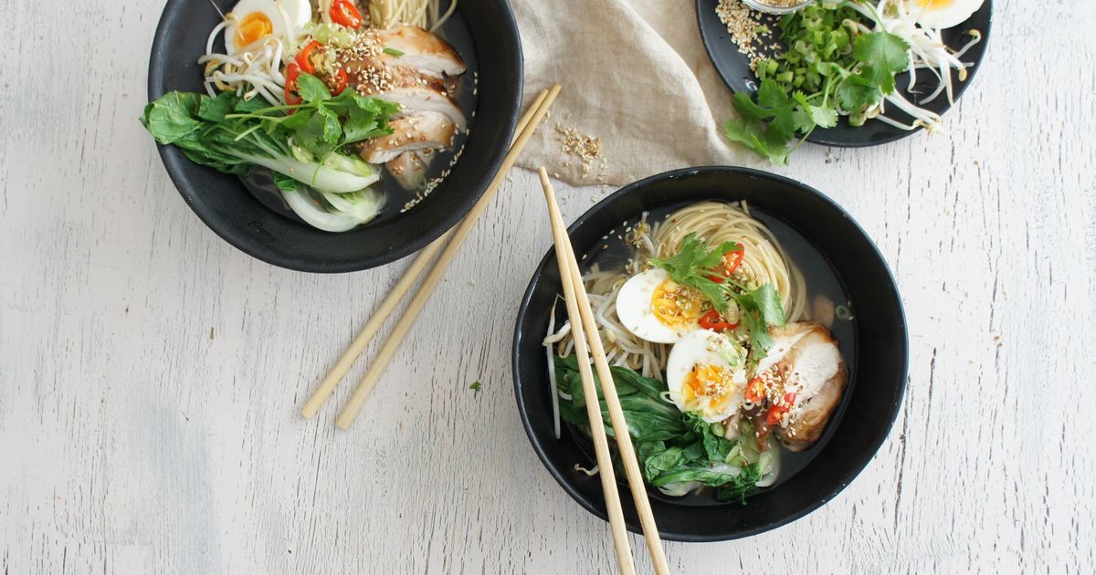 Transfiera los fideos de caldo a un tazón grande. Coloque el pollo, los brotes de soja, las cebolletas, la pimienta y la cantidad de repollo encima de los fideos.