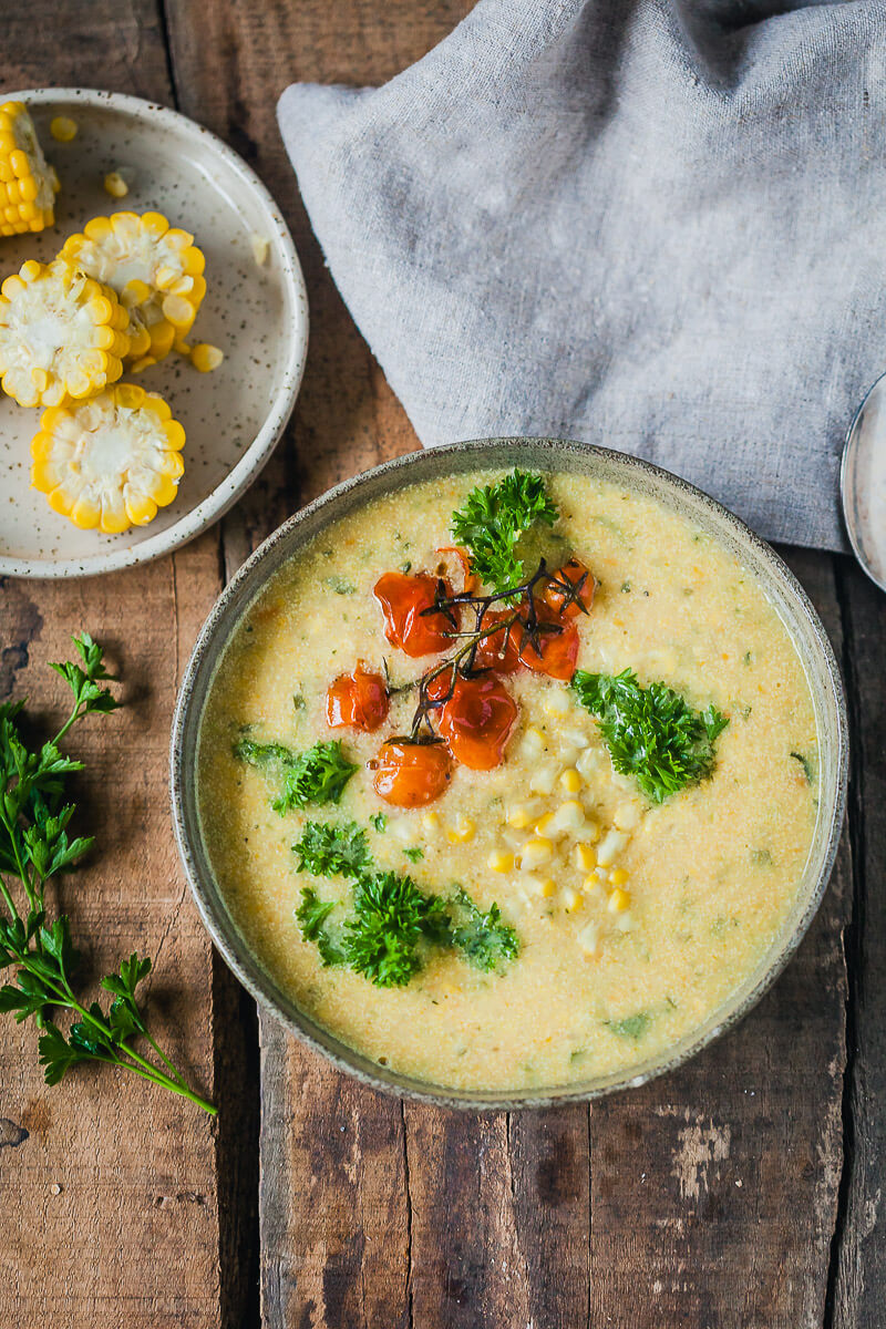 Esta sopa de maíz con calabacín está llena de verduras, es cremosa y saludable. ¡Y es vegano y sin gluten!