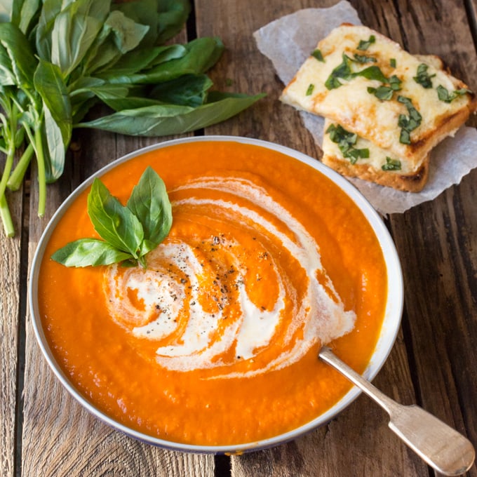Sopa cremosa de tomate, albahaca y pan tostado: ¡las verduras ocultas agregadas lo hacen muy saludable e indulgente al mismo tiempo!