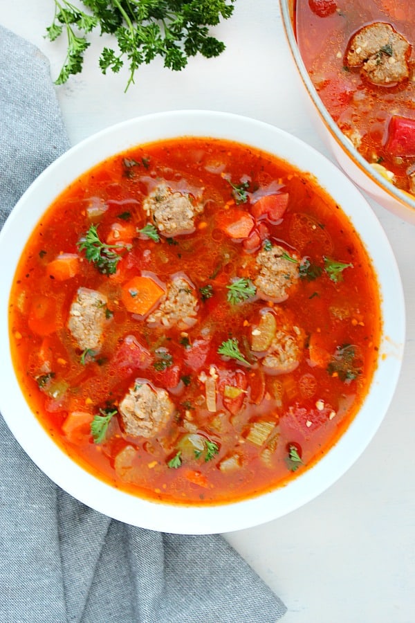 sopa de albóndigas Es una sopa de albóndigas mexicana a base de tomate. Está lleno y lleno de sabor porque las albóndigas se cocinan en el caldo.