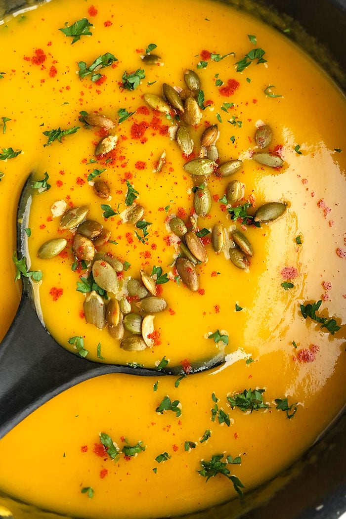 Todo tipo de calabazas sabrosas están disponibles durante la temporada de otoño, y puedes aprovecharlas al máximo en la receta abundante y reconfortante de hoy. Es tan delicioso como mi sopa de zanahoria y jengibre y esta sopa de camote.
