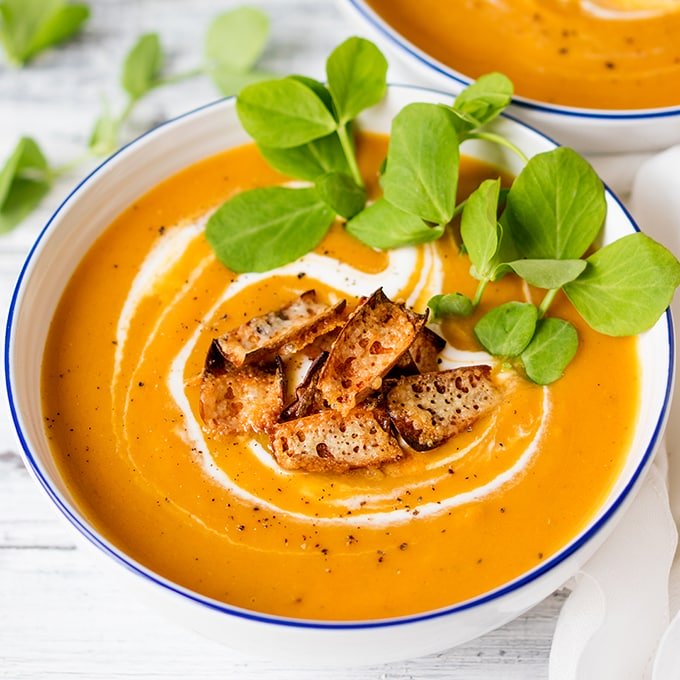 Sopa De Camote Y Zanahoria Al Horno Con Crutones De Cáscara De Papa Y Queso Cheddar