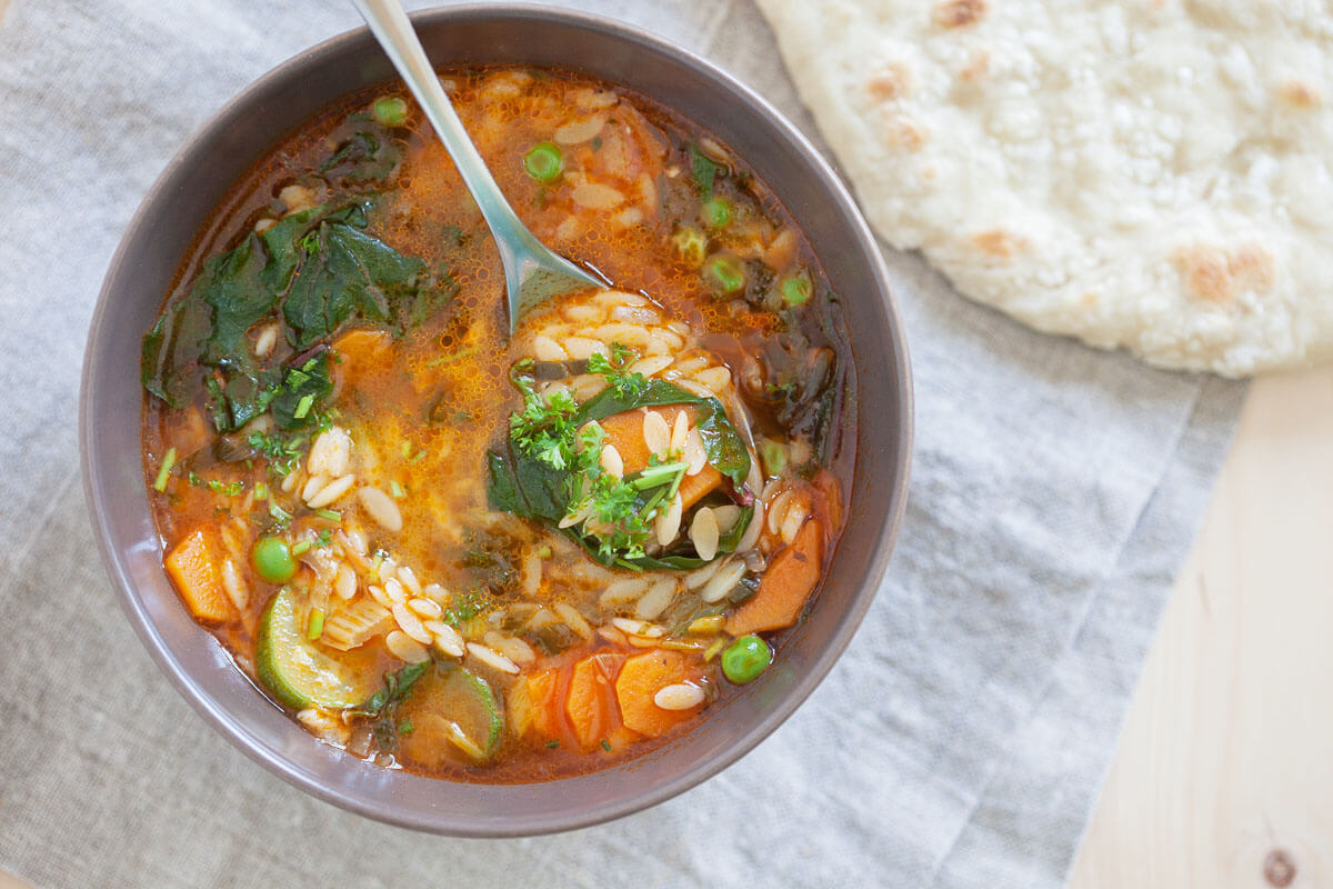 Con los primeros calabacines y acelgas apareciendo en mi patio trasero y algunas temperaturas de verano por debajo del promedio, rápidamente preparé una saludable sopa de cebada.