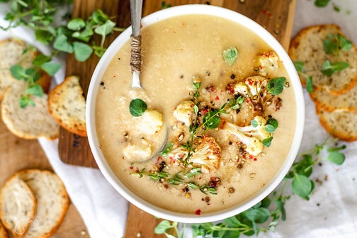 Esta receta de sopa de coliflor es vegana, pero no obligatoria en absoluto. Agregue un poco de crema espesa o una cucharada de crema agria si lo desea, ¡o incluso espolvoree con tocino!