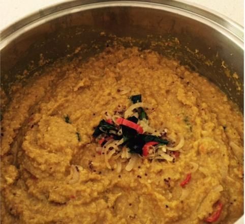 Para la tarka: Caliente el ghee en una sartén a fuego medio. Agregue el comino, las semillas de mostaza y cocine, revolviendo durante 1 minuto o hasta que estén aromáticos. Agregue las hojas de curry, cocine por 30 segundos o hasta que estén aromáticos. Agregue la cebolla y cocine, revolviendo durante 4-5 minutos, hasta que esté dorada. Agregue el ajo, la pimienta y la cáscara y cocine, revolviendo durante 2 minutos o hasta que esté aromático.